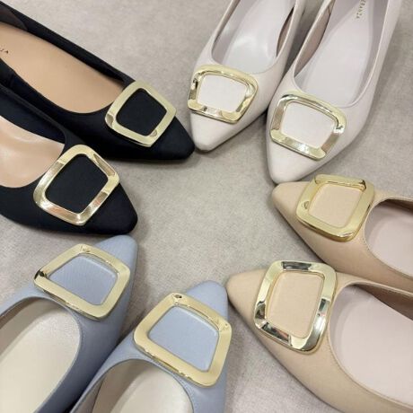 マットな生地を使用した、スクエアバックルが特徴のお仕事でもお出掛けにも使いやすいパンプスです。