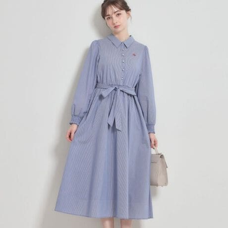 コンパクトな衿と袖口のシャーリングフリルデザインが可愛いシャツワンピース。