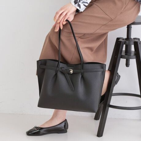 フロントのベルトデザインが洗練されたA4サイズトートバッグ
