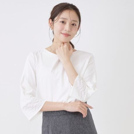 本体は伸縮性のあるポンチ素材で、袖のレースはコットンタッチなのでデイリーに合わせやすいアイテムです。