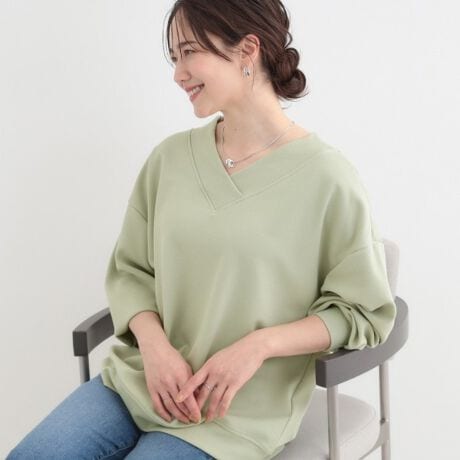 深めのVネックが顔周りをすっきりと見せながら、女性らしい印象に仕上げています。