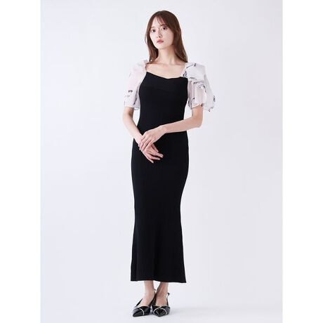 美シルエットなニットワンピースに、ふんわとしたオーガンジー生地の袖をドッキングさせたエレガントなロング丈のニットワンピースが届きました。キラキラと艶めくオーガンジーで切り替えた袖は、左肩をリボンライクにふんわりとアシンメトリなデザインを加えて、ドレッシーな仕上がりに。トップはリブを構築的に入れてフィット感を出し、ウエスト周りはすっきりとクリーンな編み地でタイトに仕上げ、スカート部分はプリーツを加えてふんわり感を出した、ボディラインを美しく演出する立体的なシルエットが魅力です。