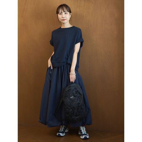 薄手のラメ裏毛トップスと、リサイクルナイロンを使用した撥水バルーンスカートのセットアイテム。