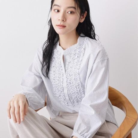 フロントの立体的なフリルデザインが華やかな印象のブラウス。