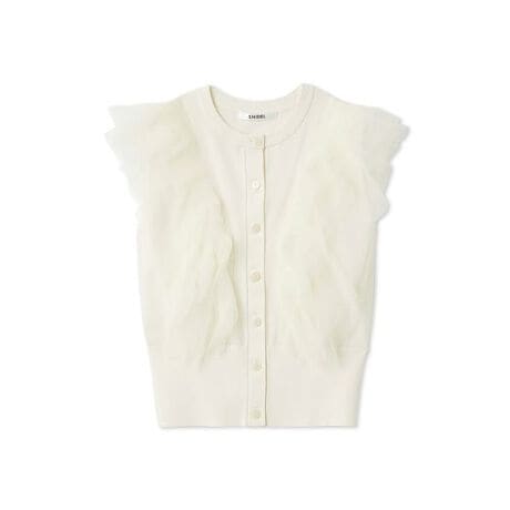 <b>【繊細なチュールフリルを前後にたっぷりとのせた人気のクルーネックノースリニット】</b>