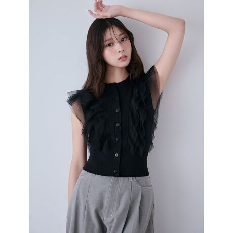 <b>【繊細なチュールフリルを前後にたっぷりとのせた人気のクルーネックノースリニット】</b>