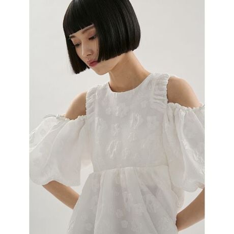 袖や裾にかけて柔らかなボリュームを持たせたデザインで、空気を含むような軽やかさと、品のある華やぎを両立。一枚で主役になる存在感のブラウスです。