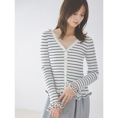 裾や袖口に同素材のプチフリルトリムを軽やかに施したV開きのリブニットカーディガンが届きました。広めのVネックでデコルテラインに抜け感をプラス。フリルトリムはカットアウトを入れてスカラップ状に編み込み、軽やかさを出しているのがポイント。前立てはマットなゴールドボタンでエレガントに仕上げました。
