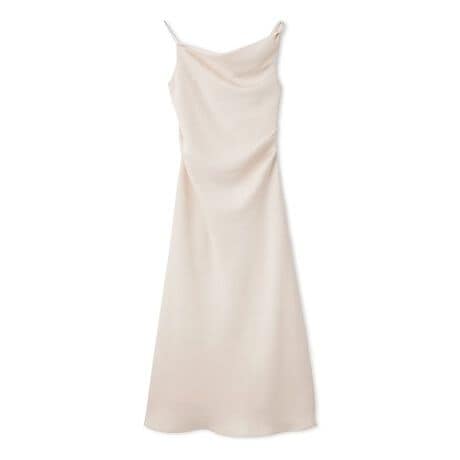 適度なハリ感がありながらも柔らかく軽やかな素材で、春先まで着やすいドレープキャミロングワンピスが届きました。タイトシルエットですっきりとエレガントなアイテムです。左右で仕様の異なる肩紐や、片側タックのアシンメトリなドレープ感など、トレンドを程よく散りばめ、シンプルなデザインの中にニュアンスをプラス。背中側は縦にダーツを入れてカーヴィーに仕上げ、後ろ姿も抜かりなく美シルエットを演出します。普段使いにも、ちょっとしたオケージョンにも活躍。サイドのコンシールファスナーで着脱可能。