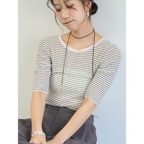 繊細な糸を使用した、5分袖のリブトップス。細ピッチのボーダー柄と無地の2タイプ展開で、スタイリングに合わせて選べる汎用性の高い一枚です。