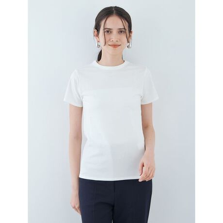 シンプルなTシャツは、シルエットと素材にこだわり、程良く身体に添うこなれ感抜け感のある印象に仕上げています。大人の女性に似合う、ミニマルで拘りが光る一枚です。デコルテラインの開いたニットアイテムと合わせて着ていただくものおすすめです。