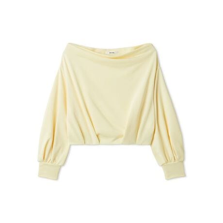裾にタックを入れてふんわりと丸みを出してフェミニンに仕上げた、オフショルタックスウェットが届きました。デコルテラインをキレイに見せる人気のオフショルデザインです。身幅はゆったりとしていてリラクシーな雰囲気をプラス。程よくハリ感のある、肉厚で滑らかな表面感のスウェット生地を使用し、キレイめなスタイリングにも合わせやすいアイテムです。
