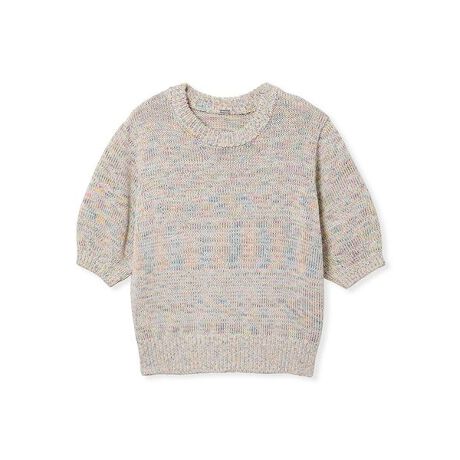 カラフルな意匠糸を使用した半袖ニット。素朴なムードのミックスヤーンを、今年らしいシルエットでスタイリッシュに編み立てています。