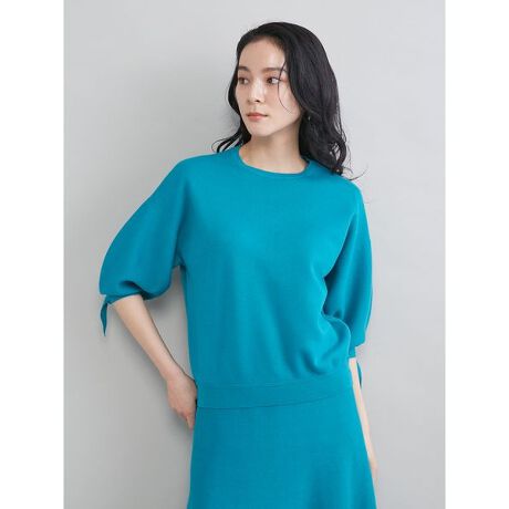 ドライタッチの素材で、袖口にリボンディティールを入れた、5分袖のニットプルオーバー。