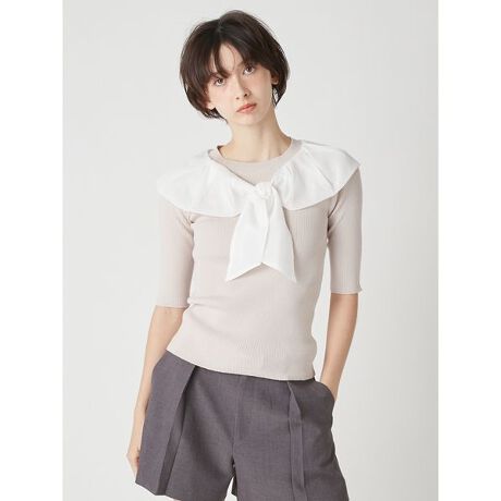 ブライト楊柳とリブニットを組み合わせた、表情豊かなドッキングトップス。バルーンカラーから流れるように繋がるボウタイが印象的で、光沢のある楊柳素材が顔まわりを明るく華やかに演出します。身頃は伸縮性のあるリブニットで編み立て、フィット感と着心地の良さを両立。同素材のシアークレープボリュームスカートと合わせるとワンピースのように着こなせ、ドレスアップからデイリーまで幅広く活躍します。