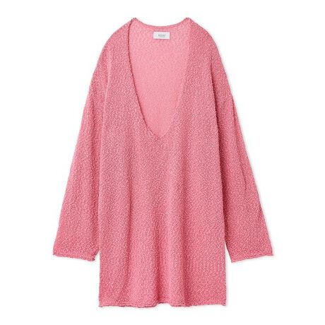 表情のあるポコポコした糸を使用し、深めのVネックデザインでインナー合わせが楽しめます。すっきりとしたボトムスとの相性が◎で身体のラインを拾いにくく安心感があるアイテムです。