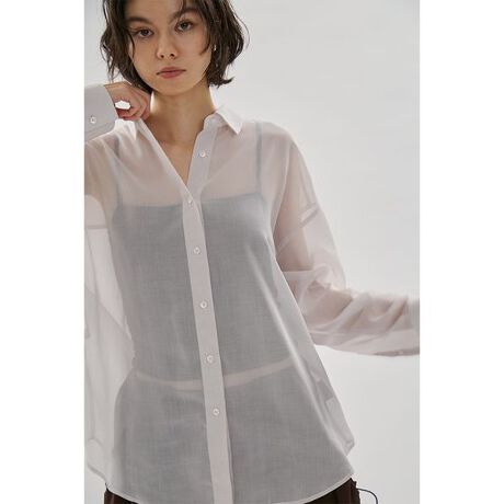 エアリーな質感と程よい透け感が魅力のシアー素材を使用したシャツ。両脇裏側にはタブとボタンを配し、シルエットの調整が可能。気分やスタイリングに合わせてフォルムを変えられ、春から夏にかけての羽織りとしても活躍します。