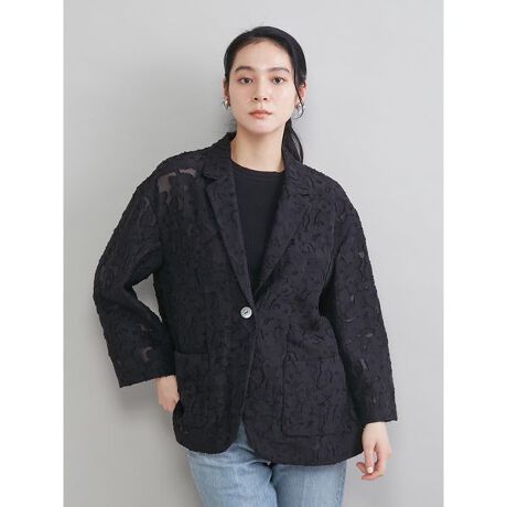美しい総柄のジャガード地を、少しカジュアルさもあるジャケットに仕立てて、こなれたムードで楽しめる一枚に。