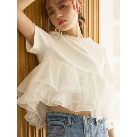 <b>【ボリューミーなオーガンジーフリルのペプラムシルエットで仕上げた上品カットソープルオーバー】</b>
