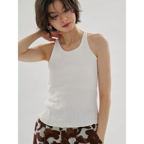 前後の広めのネックラインと華奢なストラップですっきり&ヘルシーさを演出してくれます。一枚でも安心して着られるカップつきで取り外しも可能。