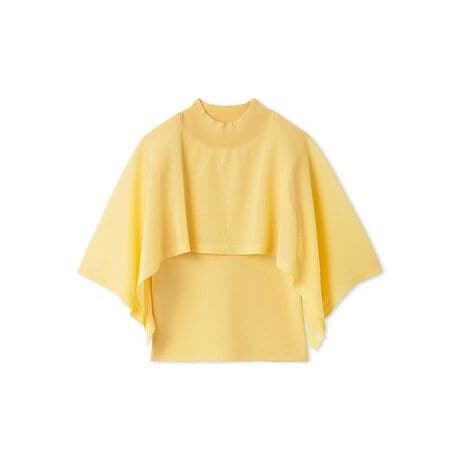 ノースリーブのすっきりとしたハイネックニットプルオーバーに、ケープデザインをドッキングさせた、エレガントなケープニットプルオーバーがお目見え。程よい身幅ですっきりとしています。空気をはらんでふんわりと揺れるケープデザインが気になる肩や二の腕周りをしっかりとカバー。身頃は透け感のないニット生地ですが、ケープ部分はほんのりと透け感を加えて軽やかにデザインしました。カジュアルなデニムに合わせたり、キレイめなスカートに合わせたりさまざまなシーンでご着用いただけます。