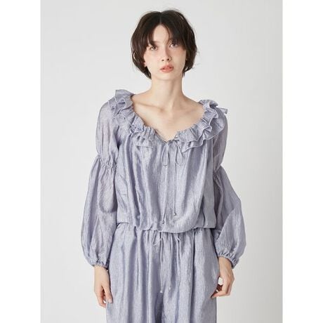 ボリュームたっぷりのダブルフリルが視線を惹きつける、着映え力抜群のブラウス。光沢のある楊柳生地が表情豊かに揺れ、リュクスでエフォートレスなムードを演出します。フリル部分は中央のリボンで絞れる仕様のため、オフショルダーとしても着用可能。リボンの先にはゴールドのコードエンドをあしらい、細部までこだわりました。袖口はゴム入りで、あえてラフに捲って抜け感を出すスタイリングもおすすめです。同シリーズのパンツ(品番LWFP261195)とのセットアップで、より洗練された着こなしが完成します。