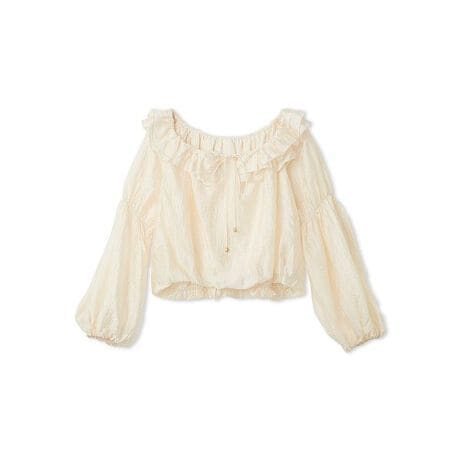 ボリュームたっぷりのダブルフリルが視線を惹きつける、着映え力抜群のブラウス。光沢のある楊柳生地が表情豊かに揺れ、リュクスでエフォートレスなムードを演出します。フリル部分は中央のリボンで絞れる仕様のため、オフショルダーとしても着用可能。リボンの先にはゴールドのコードエンドをあしらい、細部までこだわりました。袖口はゴム入りで、あえてラフに捲って抜け感を出すスタイリングもおすすめです。同シリーズのパンツ(品番LWFP261195)とのセットアップで、より洗練された着こなしが完成します。