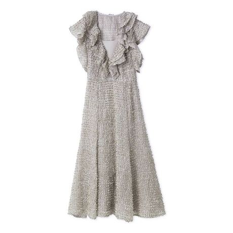 起毛糸でフリンジ感を加えた上質な生地を使用し、たっぷりとラッフルフリルを効かせたフェミニンでエレガントなドレスが届きました。表の生地は、ほんのりハリ感があり柔らかさもあるシアーオーガンジーに起毛糸が施されています。デコルテラインをきれいに見せる深めのVネックには、フリルを贅沢に2段であしらい、顔周りも華やかに。胸元からはインナーワンピースが見えるデザインです。袖も、肩周りの肉感をカバーしつつエレガントなフリルスリーブで仕上げました。背中側のウエスト位置にはゴムシャーリングをプラス。細リボンでシルエットを調節いただけます。スカート部分はフレアシルエットで美シルエットに仕上げました。