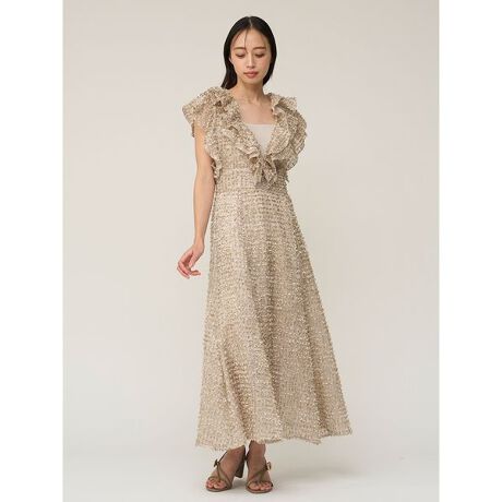 <b>【フリンジ感を加えた艶やかで個性的なファブリックが目をひく、たっぷりフリルドレス】</b>