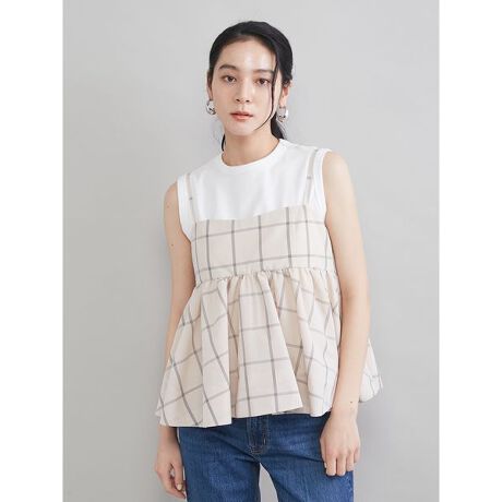 <b>【立体的なペプラムと、今年らしいチェック柄が着映えするキャミ。インナーカットソーがセットになった万能アイテム】</b>