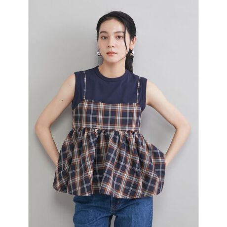 <b>【立体的なペプラムと、今年らしいチェック柄が着映えするキャミ。インナーカットソーがセットになった万能アイテム】</b>