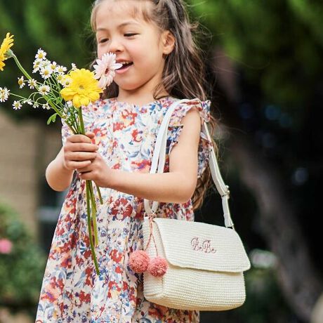 脇に下げられたラフィアのポンポンがポイントになっています。