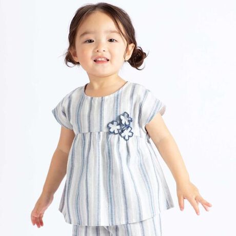 コサージュをつけたようなお花モチーフがかわいいブラウス。