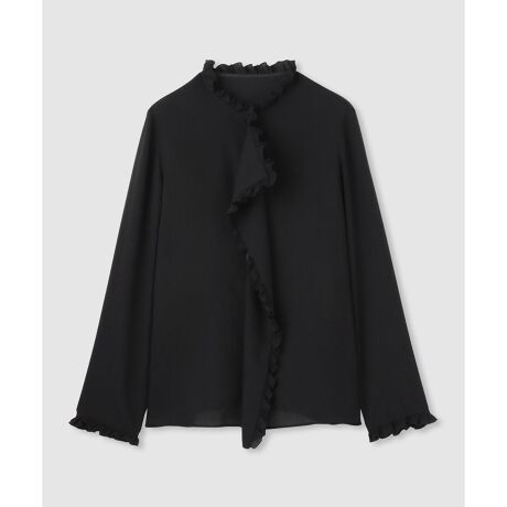衿ぐりやヘム端、袖口にあしらったプチフリルがさりげないアクセントに。