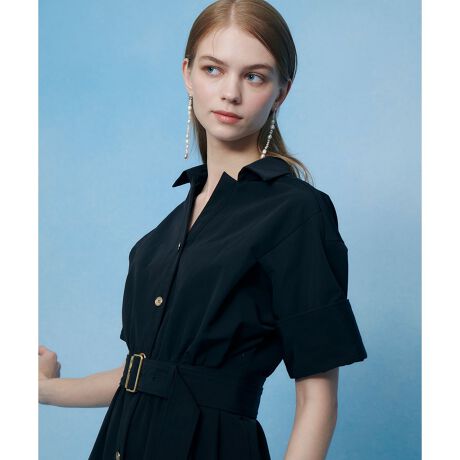 肘丈の袖は、カフスを折り返してアレンジするのもおすすめ。スカート部分はタイトな裾回りですが、フロント裾のボタンを開けて、足さばきや表情の変化も楽しんでいただけます。