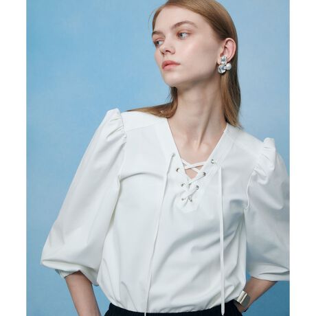 袖山にタックギャザーを入れ、カーブを描くラインでふんわりとしたフォルムに。たっぷりとボリュームを持たせたスリーブが、印象的な一枚です。金属ハトメのスピンドルエンドが、さりげなくきらりと光るアクセントに。