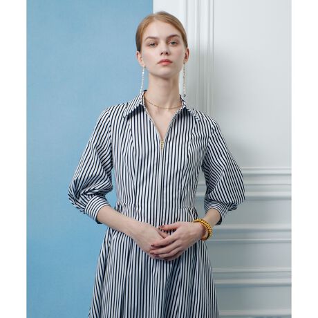 <素材>綿の爽やかな印象のストライプと無地のキレイ目なグログランの2素材展開です。<デザイン>やや肌寒い季節にぴったりな7分袖丈。袖口にタックを入れたパフスリーブデザインです。ウエスト切り替えでスカートにはタックを取ったフィット&フレアーの女性らしいシルエット。フロントにはZipで開閉。お好みの開きでご着用頂けます。