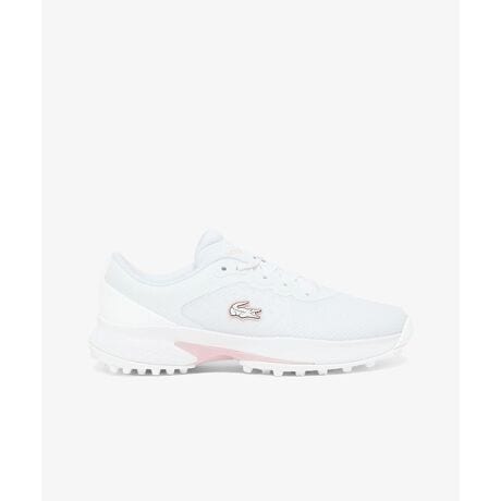 [型番:51SFA0020]テクニカルなコーティングメッシュアッパーにラバースパイクソールを配したウィメンズゴルフスニーカー・テクニカルな表情に撥水性を備えるコーティングメッシュアッパー・クリーンなワントーンデザインに、女性らしいペールトーンのアクセントカラー・コース場で高いグリップ性を発揮するスパイク形状のポイントドットアウトソール・サイドにTPU製ワニロゴパッチを配置