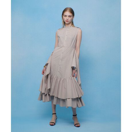 スカートの脇にあしらったヘムドレープがポイントのティアードシャツワンピース。そのまま垂らしても良し、釦で留めてフロントやバックにドレープを出したり、ウエストで結んでも素敵です。何通りもアレンジが可能なので飽きの来ない1着です。大人っぽいブラウンストライプは身頃とスカート,ティアード部分と柄の向きを変えていてより動きのある見え方になっています。