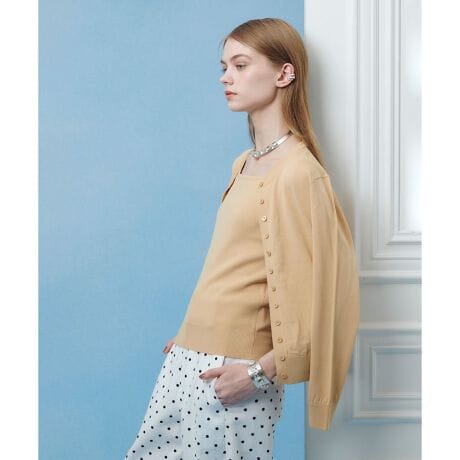ロングヒット中のスクエアタンクにアンサンブル出来るカーディガンが登場。スクエアタンクは下着が響かない様に程よく厚地なのに対して、羽織るカーディガンは軽めに仕上げました。これから暑くなるシーズンにも羽織りアイテムとして重宝します。サラリとした肌触りの素材は通年使えるアイテム。今年らしい多釦フロントがアクセント。