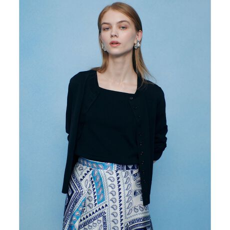 ロングヒット中のスクエアタンクにアンサンブル出来るカーディガンが登場。スクエアタンクは下着が響かない様に程よく厚地なのに対して、羽織るカーディガンは軽めに仕上げました。これから暑くなるシーズンにも羽織りアイテムとして重宝します。サラリとした肌触りの素材は通年使えるアイテム。今年らしい多釦フロントがアクセント。