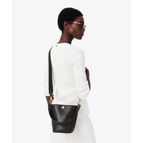 テニス由来のディテールをエレガントに溶け込ませたバケットバッグミニマルなデザインが上質で滑らかなスムースレザーの風合いを際立てるコンパクトなバケットバッグ。テニスボールをモチーフにしたゴールドトーンの留め具がリュクスな印象を放ち、さりげないアクセントに。コンパクトなサイジングながら、マチのあるバケットフォルムがお出かけの必需品をスマートに収納。着脱式のショルダーストラップ付きで、その日のスタイリングに合わせてハンドルバッグとクロスボディの2wayで楽しめます。