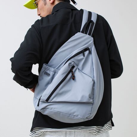 軽量かつソフトで肌触りの良いコットンライクな撥水ポリエステルを採用し底面を広く取りより三角型にボリュームを出したこだわりのシルエットと フロントのマチ付きポケットも全体バランスを考慮し表情を大人しく主張させています。
