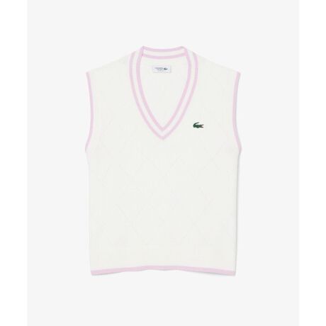 [型番:AF9602-10]アーカイブ由来のダイヤモチーフを軽やかに編み立てたストレッチニットベスト・レーヨン×ポリエステルのストレッチビスコースニット素材・伸縮性と通気性を両立する薄手の編地・アーカイブに着想したダイヤモチーフを全体に表現・クラシックなアクセントを生む、首・袖・裾の配色ライン・左胸にシリコン製のワニロゴパッチRegular Fit