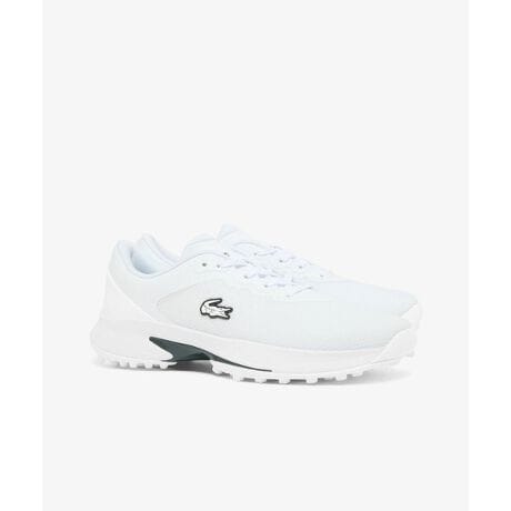 [型番:51SMA0027]テクニカルなコーティングメッシュアッパーにラバースパイクソールを配したゴルフスニーカー・テクニカルな表情に撥水性を備えるコーティングメッシュアッパー・クリーンなワントーンデザインに、ラコステらしいグリーンのアクセントカラー・コース場で高いグリップ性を発揮するスパイク形状のポイントドットアウトソール・サイドにTPU製ワニロゴパッチを配置
