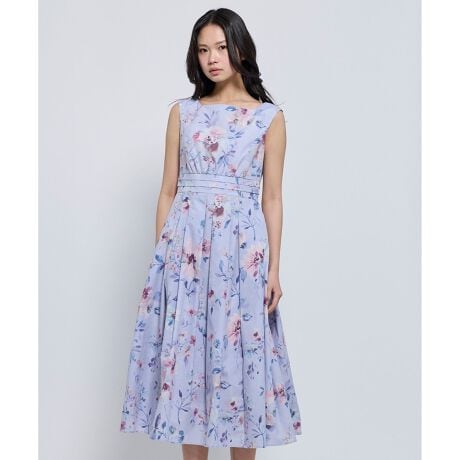 上品なフラワープリントが目を惹くノースリーブドレスは2色展開でそれぞれ異なる配色で表情を変え、淡く優しいカラーリングが大人フェミニンな印象を与えてくれます。デコルテをスッキリ見せるラウンドネックと程良くフィットするウエスト切り替えデザインで、自然なスタイルアップ効果もあります。