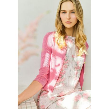 淡いフラワープリントが全体に施された、清楚でフェミニンなデザイン。透け感のある軽やかな素材に細かな格子状の織りが重なり、上品で涼し気な印象を与えます。ネックはシンプルなラウンドネックでノースリーブとスッキリとしたシルエットに。ウエスト部分に切り替えを入れ、自然に広がるAラインを作りました。
