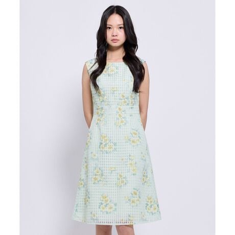 淡いフラワープリントが全体に施された、清楚でフェミニンなデザイン。透け感のある軽やかな素材に細かな格子状の織りが重なり、上品で涼し気な印象を与えます。ネックはシンプルなラウンドネックでノースリーブとスッキリとしたシルエットに。ウエスト部分に切り替えを入れ、自然に広がるAラインを作りました。