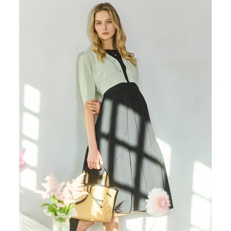 デコルテをスッキリと見せるネックラインにウエスト切り替えで自然なメリハリのあるシルエットを演出。スカート部分はティアード風デザインで、歩くたびに軽やかに揺れフェミニンな印象をプラスします。