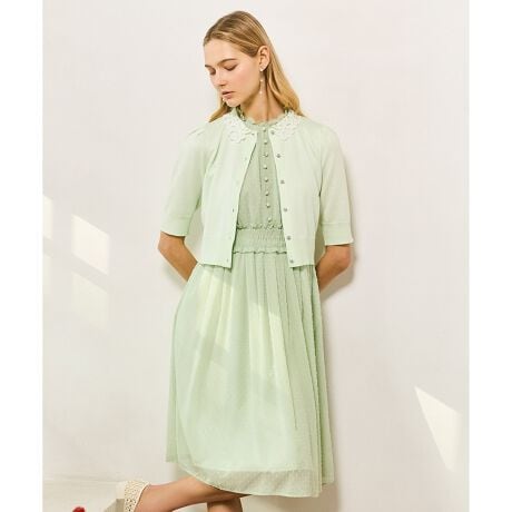 春色の爽やかな色展開で、小さなドット柄のシフォンジャカード素材のドレス。 とても涼しげで軽やか、シワにもなりにくく機能的です。上身部分はコンパクトなサイズ感で、涼しい季節は上からニットを羽織って襟をチラ見せしても上品な印象になります。